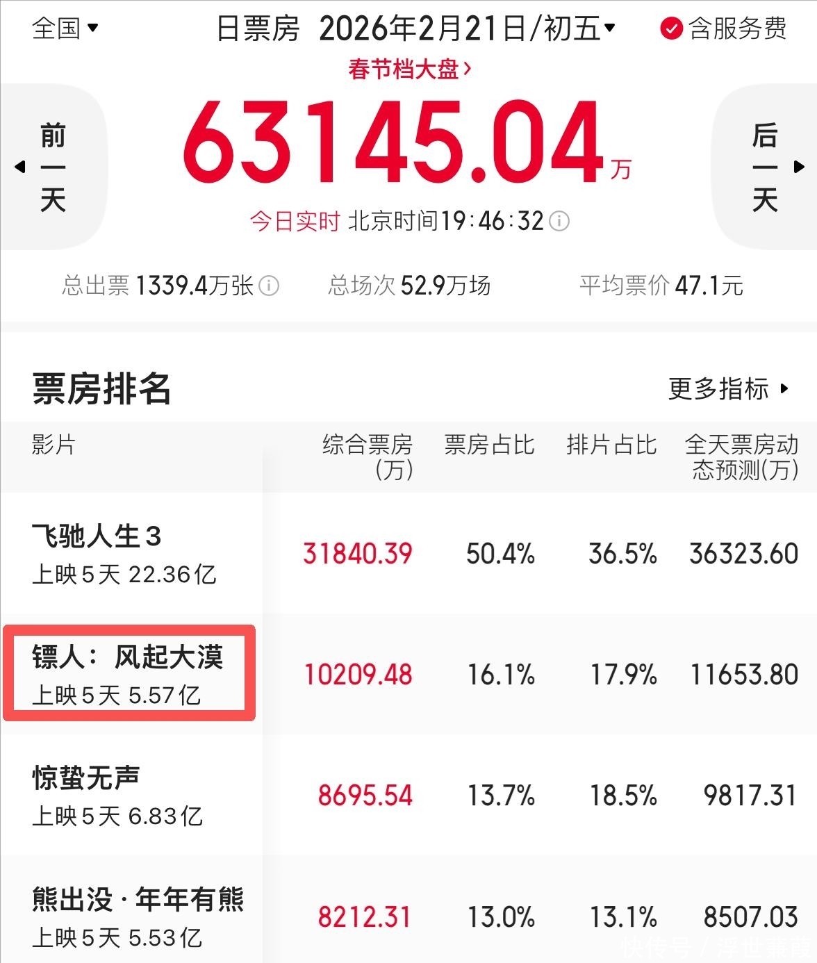 截至2月21日,其单日票房已稳定攀升至第二位。