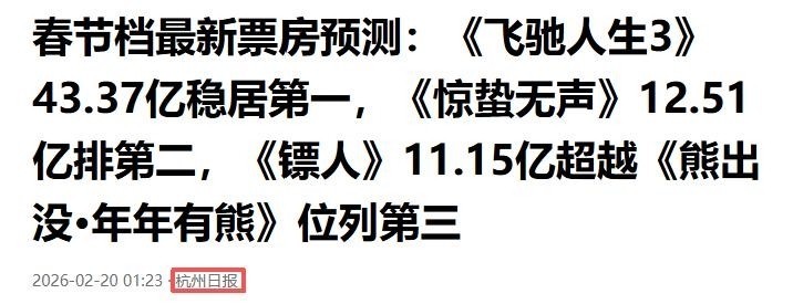 部分参考资料:1、春节档最新票房预测:《飞驰人生3》43.37亿稳居第一,《惊蛰无声》12.51亿排第二,《镖人》11.15亿超越《熊出没·年年有熊》位列第三.杭州日报2、2026春节档过半票房超31亿 《镖人》票房逆跌或凭口碑逆袭.封面新闻3、《镖人》单日票房升至第2,观众催拍续集,吴京回应:争取有第二部;《镖人2》去年7月已备案公示,故事梗概公开.极目新闻