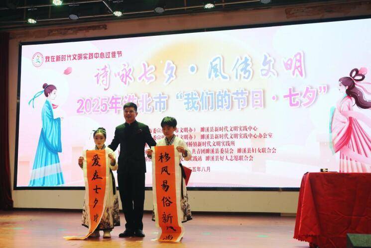 活动在古琴声中诗意开场。现场,经典诗词诵读与书法创作同步进行,民俗专家精彩解读传统七夕习俗及其蕴含的健康婚恋观。原创节目三句半《新风七夕谣》用诙谐生动的本土语言传播现代文明理念,赢得阵阵掌声。来自“最美家庭”“身边好人”代表先后登台,分享自家故事、朗诵家风诗篇。互动环节时,多位观众分享夫妻相处、家风传承的感人经历。最后,青年团员朗诵《七夕文明公约诗》,展现了年轻一代践行文明新风的决心。