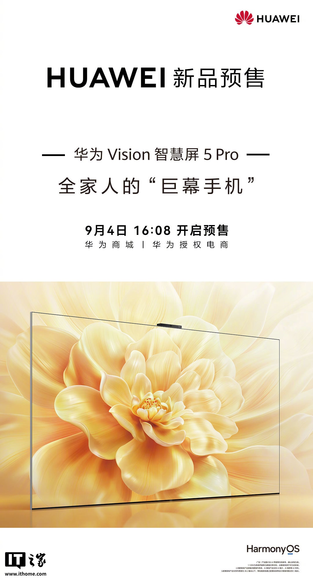 IT之家从华为官方预热海报小字获悉,华为 Vision 智慧屏 5 Pro 拥有 30W 功率扬声器,搭载鸿蒙 HarmonyOS 操作系统,支持 AI 搜片等特性,可贴墙安装。