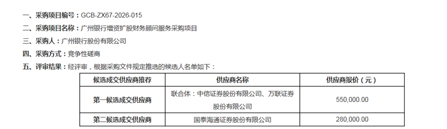 蓝鲸新闻3月6日讯(记者 金磊)3月5日,广州银行官网发布增资扩股财务顾问服务采购项目竞争性磋商结果公示。第一候选成交供应商为中信证券股份有限公司、万联证券股份有限公司联合体,报价为55万元;第二候选成交供应商为国泰海通证券股份有限公司,报价为28万元,两者报价相差近一半。