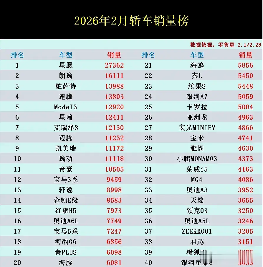 导读:2026年2月轿车排行榜已正式揭晓了!一场前所未有的激烈竞争格局重塑正在上演。根据最新出炉的零售销量数据,本月销量榜单头部格局发生剧烈震动,新能源车型与传统燃油车的市场地位均出现了显著变化。其中本月最大的亮点无疑是星愿,以27362辆绝对优势强势拿下榜首位置,将一众长期霸榜的老将甩在身后,朗逸以16111辆位居第2,虽保住了亚军位置,但与榜首差距十分明显。 速腾(13803辆,第4)、帕萨特(13988辆,第3)、迈腾(11232辆,第8)等德系主力也都仍居榜单前列,但增长势头明显受到新势力的挤压。新能源Model3的攻势同样迅猛,以12920辆位列第5,保持稳定输出。变天了!2月轿车销量榜:朗逸亚军,凯美瑞第9,轩逸跌出榜单前10