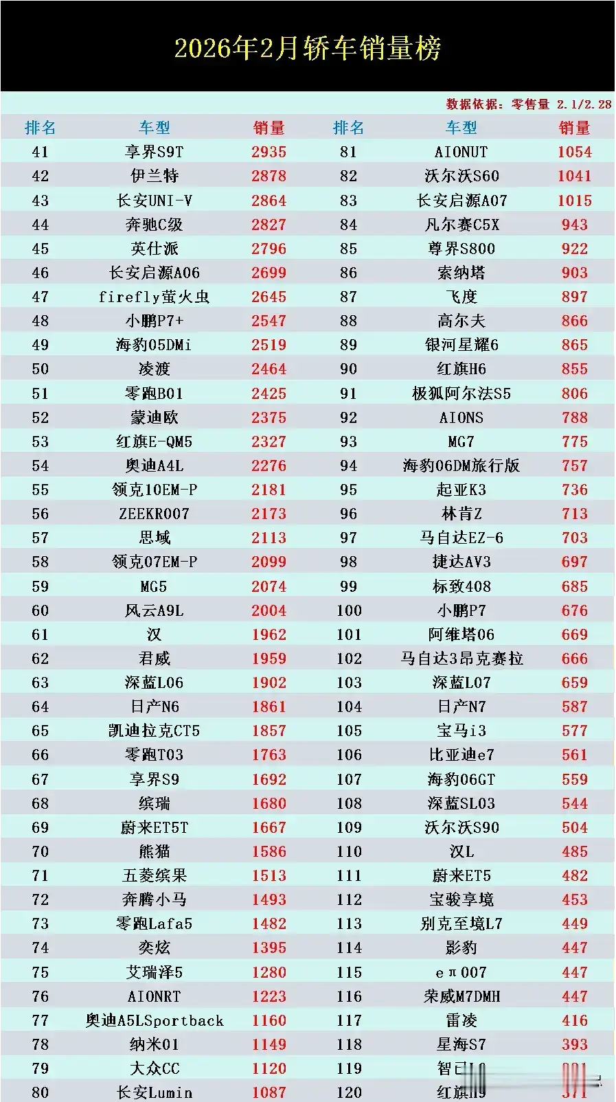 此外、自榜单第40名以后市场同样暗流涌动。合资主流车型中的伊兰特(2875,第42)、思域(2113辆,第57名)、日产N6(1861辆)表现分化明显。大众CC(1120辆,第79名)则略显掉队。但也有多款新能源新面孔车型表现可圈可点,比如零跑B01(2425辆,第51)和风云A9L(2004,第60)双双破突破2千辆,排名逐渐进入榜单中部。奇瑞艾瑞泽5、AIONRT也成功再次闯入前80名,成为不可忽视的力量。长安启源A07(1015辆,第83)作为一款中大型轿车,保持了稳健的市场表现。另外、红旗H6、小鹏P7、汉L、星海S7等车型的也都纷纷入榜前120名,也说明了自主品牌在新赛道上的全面布局正在开花结果。