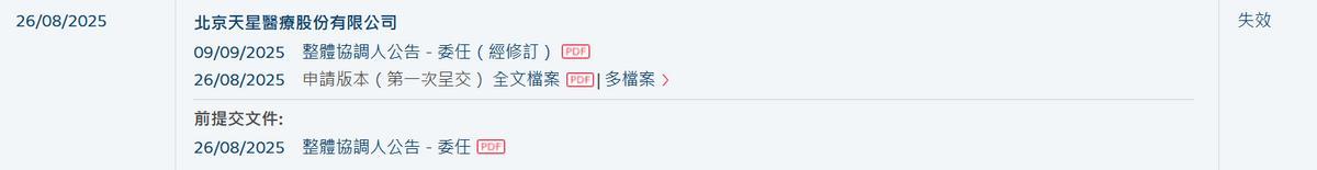2026年2月26日,北京天星医疗股份有限公司(以下简称天星医疗(601567))于2025年8月26日递交的港股招股书满6个月,失效。中信证券(HK6030)、建银国际为联席保荐人。